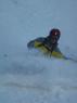 kmalu opustil svoje mazohistične ambicije, saj so prijetne stopničke vse do vrha žlebu. Za smuko snega več kot dovolj, in smuči je potrebno sneti le