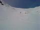 proti jugu. Midva pa sva nadaljevala v smeri dolinice naravnost vzhodno navzdol proti planini Blato. Smuka sprva poteka po strmi dolinici, potem pa