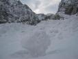 Mimo zaprte koče v Krnici,v prijetnem hladu do ogromnega plazu,ki je menda tam že kar dolgo.Ker sva bila malo visokom sva ga prečila brez smuči,a če