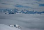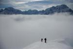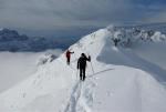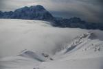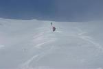 nad meglo do grebena.Od tu naprej sem se sam s smučmi na ramah povzpel še na vrh.Pri smučanju z vrha se je izkazalo,da je pod novim snegom malo