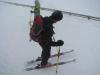 Martin in pancarji brez napak. Po romarski poti je super vzpon. Na Višarjih je danes kraljevala megla. V dolino smo smučali po smučišču.