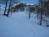 sedla rahlo odpuščen sneg, nižje samo še pršič in rahla kloža. Pri spodnji planini grem do ceste, tudi tam je stara gaz krpljarjev in vsaj enega