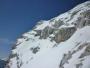 prisojna pobočja, pa so bile razmere bistveno slabše. Ojužen sneg na trdi, poledeneli podlagi. Ugotovil sem, da bo treba smučati zelo previdno.