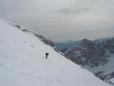 Ker svaz Matjažem imela dovolj časa sva si za očaka vzela dva dni.V sredo počasi na Kredarico in popoldansko sončenje in večerni panoramski sprehod.Zvečer pa ob gledanju rokometne tekme,prav prijetno zaspiva na toplem-na klopi.Zjutra ob koprenasti oblačnost sva ob pol osmih že na vrhu.Koprena ne popusti cel dopoldan,zato v zelo neugodnih razmerah smučava po skorji.Ubereva varianto pod Ržjo in mimo stare pastirske koče v zg.Krmo,kjer se razmere izboljšajo-pršič.Ko sediva v Aljaževem hramu le sonce stopi visoko oblačnost.