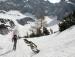 Tudi Ledine nudijo zelo dobro pomladansko smuko. Z Andrejem nisva bila ravno zgodnja..šele ob 10h sva krenila s parkirišča nad Planšarskim jezerom nad Jezerskim. Smuči sva seveda spet tovorila - po lovski poti do Koče na Ledinah, potem pa ...problemi s psi, ki so bili še od ture prejšnjega dne malo preveč na(o)piti :) in jih nikakor nisva mogla "pripopati" na smuči. Šele z dodatnimi pripomočki nama jih je uspelo pritrditi, tako da sva lahko prilezla pod Ledinski vrh. Spet postanek, razgledovanje, meditiranje, fotkanje in vse kar spada zraven, potem pa priprava in juhuhu...... Če bi bila na vrhu kako uro prej, ne bi bilo slabo, ampak...kljub temu sva uživala. Pod kočo sva vzrajala, dokler se je dalo..še kakih 50 višincev. In ko ni bilo več druge izbire, sva spet natovorila smuči in udarila pešaka do parkirišča . Seveda je bila potrebna rehidracija, za katero sva poskrbela v koči ob jezeru v prijetni družbi Katarine in Dragana, s katerima sva že delila turno-smučarske užitke pod Kriško steno.