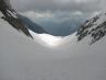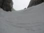 po kateri je treba biti pazljiv, tudi nižje smučam po plazovini vse dokler gre. Sledi prečenje čez nekaj orjaških plazovin, potem pa na pot in po