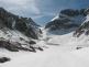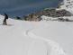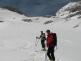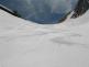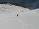 pod Bilo pečjo. Dve sledi predhodnikov zavijeta proti desni, mi pa v miru pomalicamo pri koči. Sledi vzpon po nekaj cm deviškega do Prevale in nato