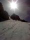 vrhom, ko sem se moral za prehod prek strmega snežišča preobuti v pancarje in dereze, tako da je bil Matjaž, ki je startal iz Planice malo prej, kot