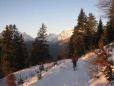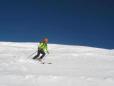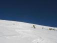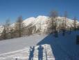 najprej proti grabnu,kateri pride na cestni ovinek.A se mi je zdelo,da je snega premalo in sva zavila proti planini in po zelo smučljivem pršiču