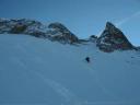 sva kmalu dosegla prvo sedlo (no, na koncu je vendarle kar konkreten 50° žleb), sledilo je malo smučanja, potem spoštovanja vredna (če snežne razmere