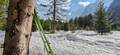 Prvi zavoj je bil previden, saj je zahrskala skorjica, nato pa nekaj zavojev v globokem meljastem snegu. Popisovala sva nedotaknjeno strmino, ki jo je prejšnji dan poljubilo sonce, da je rahla skorjica poletavala iz zavojev. Nižje pa en sam pršič. Do 30 cm na trdi podlagi. Vriskava do macesnov, kjer se spogledava: seveda, še enkrat pod steno. Zopet sva zavriskala risaje vijuge v pršiču. Srednji del je manj ugoden za od zgoraj na mehkobo razvajena kolena. Nižje v smeri struge pa je sneg že poljubljala pomlad, saj so se grbinice že toliko zmehčale, da je bilo vijuganje bolj mehko. Po gozdu udeneva pot in po njej izkoristiva vsak meter spusta za vijuganje.